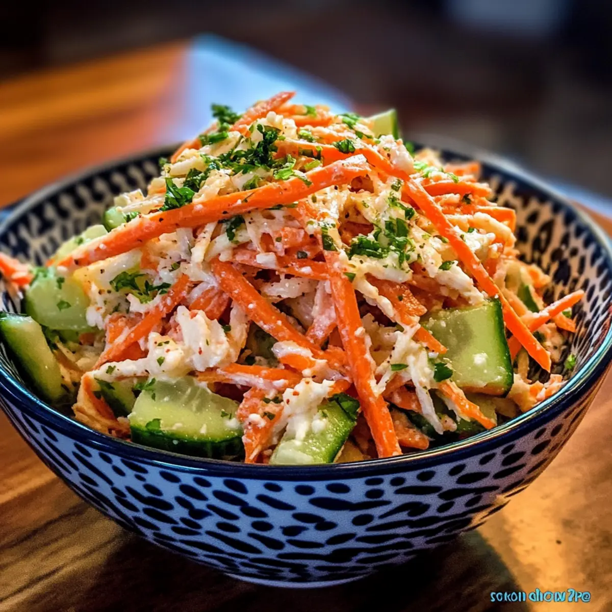 - Zutaten zusammenfügen: Julienniertes Gemüse und zerkleinertes Kani mit dem Dressing vorsichtig vermengen.