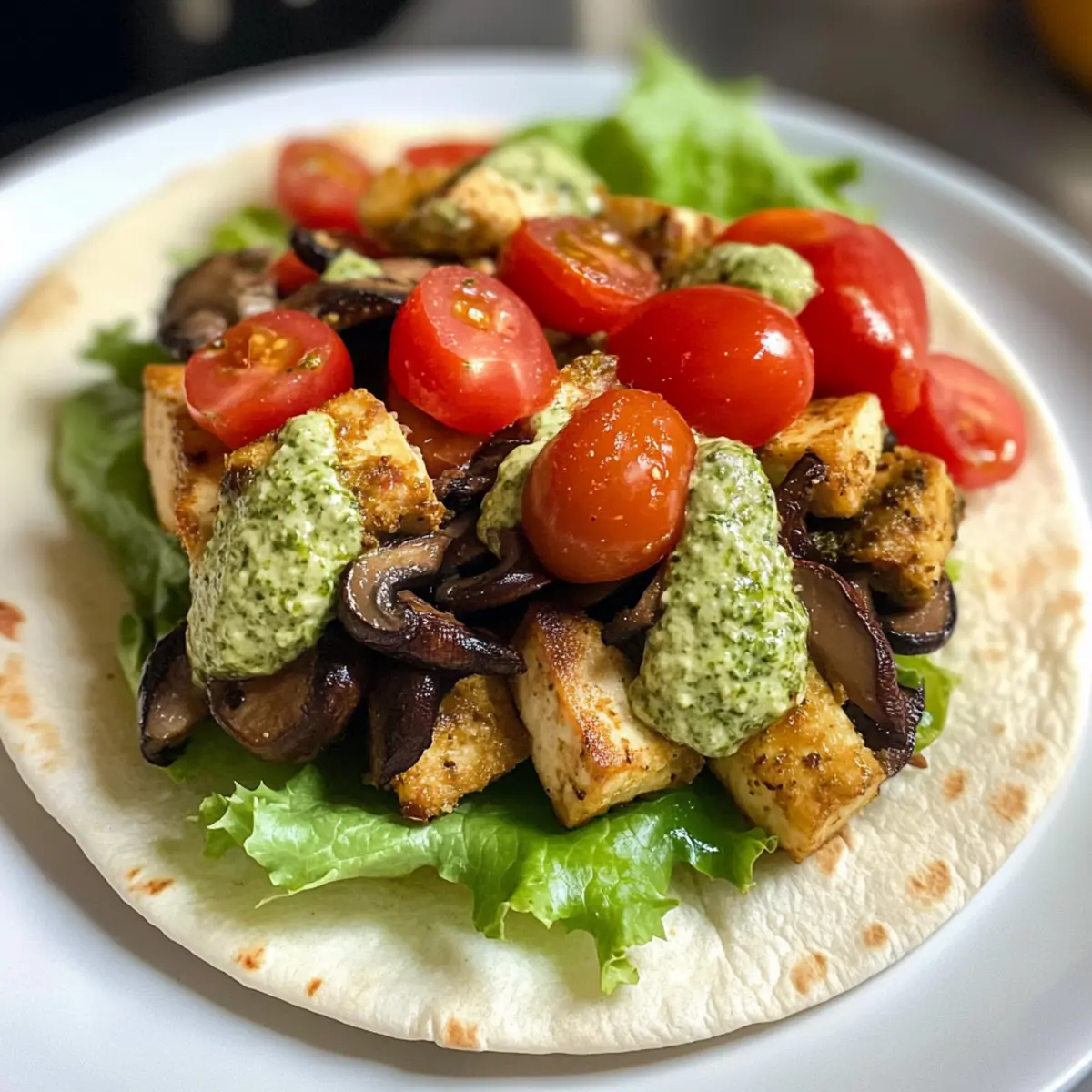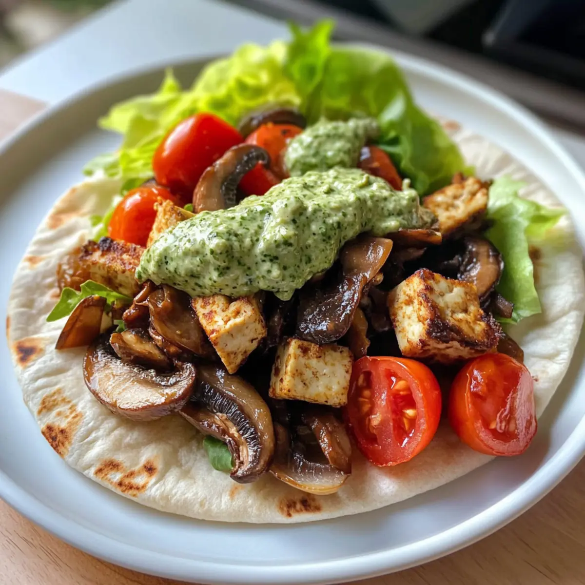 Nehme ein warmes Pita-Brot und verstreiche eine großzügige Menge der Pesto-Mayo darauf. Füge eine Schicht frischen Salat, dann den karamellisierten Tofu und die angebratenen Pilze hinzu. Ergänze mit geschnittenen Kirschtomaten und, wenn gewünscht, einem Spritzer Chiliöl für eine extra scharfe Note. Klappe das Pita-Brot zusammen oder wickele es ein, um deine köstlichen Wraps zu genießen.