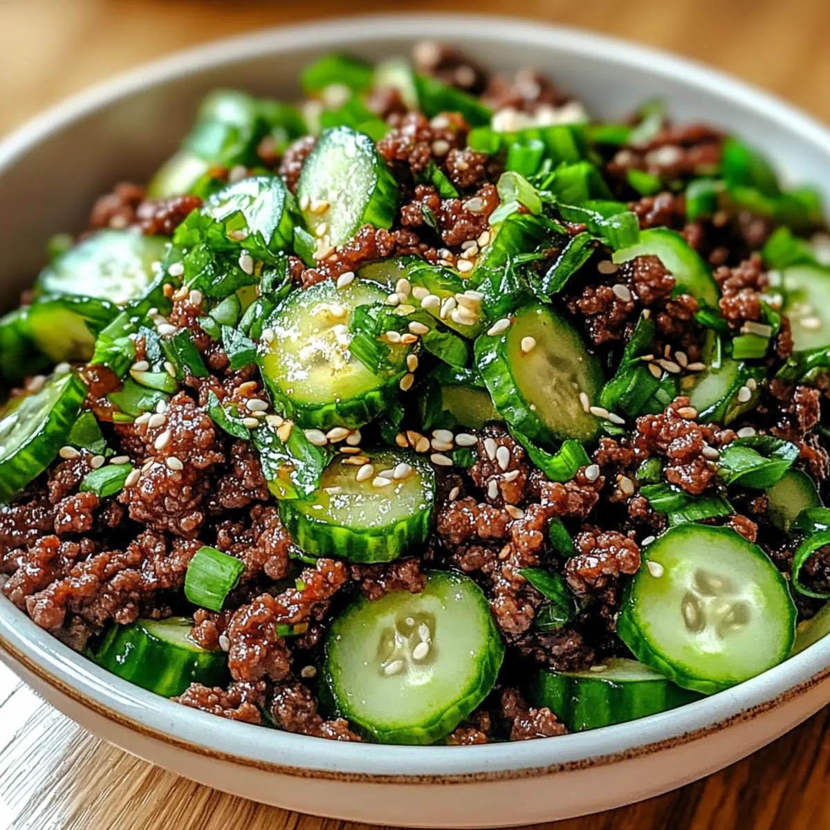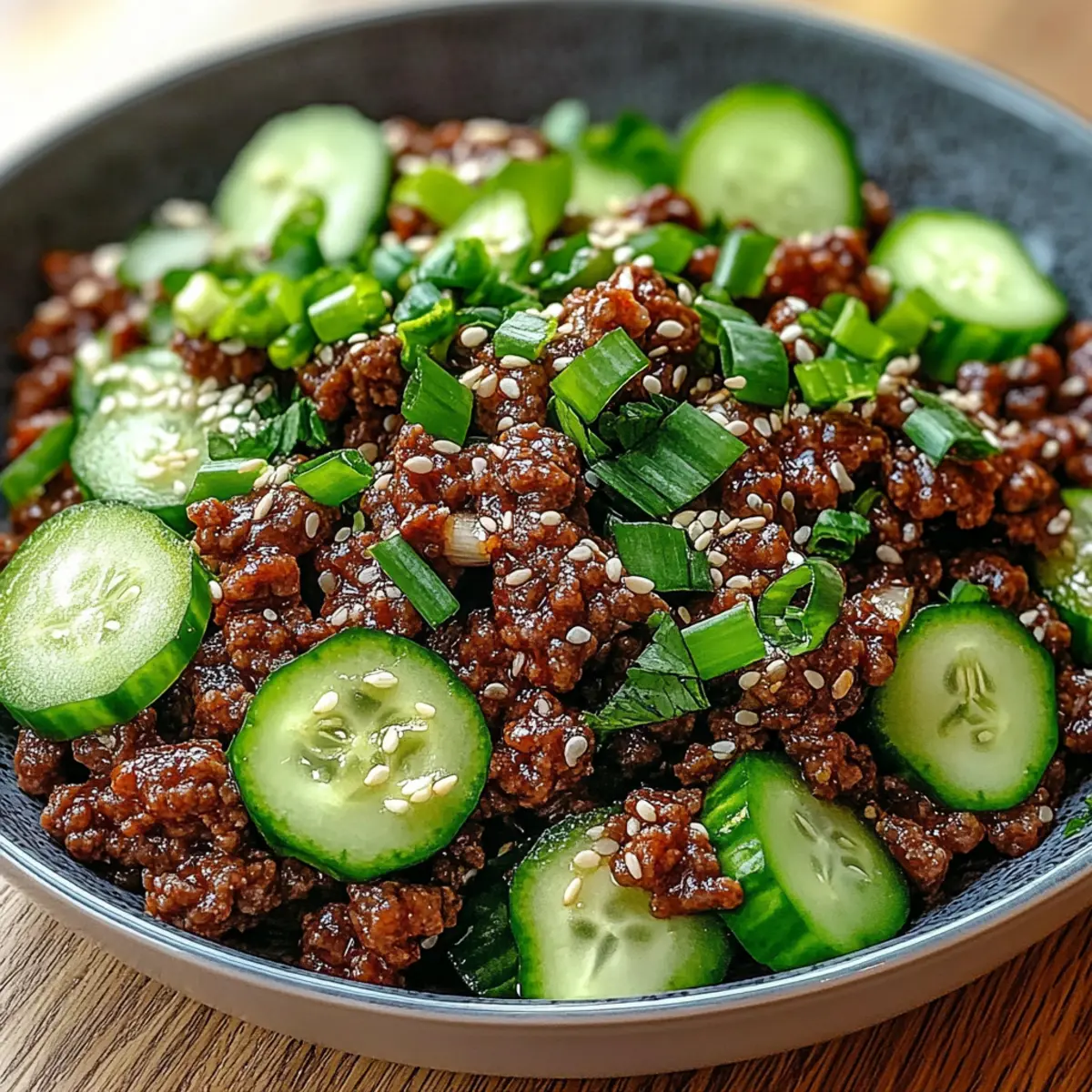 Serviere das würzige Keto Koreanische Hackfleisch zusammen mit dem Gurkensalat auf einem Teller. Du kannst nach Belieben zusätzlichen Sesamöl über das Gericht träufeln, um den Geschmack zu intensivieren. Diese Kombination aus saftigem Hackfleisch und knackiger Gurke wird deine Gäste begeistern und jeden Abend zu einem besonderen Erlebnis machen.