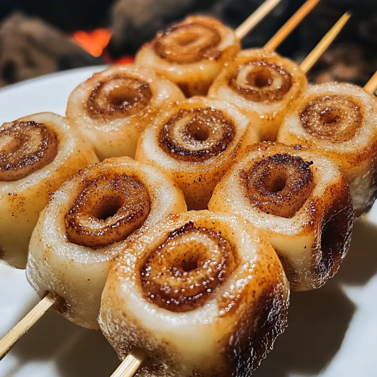Stecke die gerollten Stücke vorsichtig auf die Skewers. Achte darauf, genügend Platz zwischen den Rollen zu lassen, damit sie gleichmäßig garen können, während du sie über dem Feuer röstest. Dies sorgt für ein gleichmäßiges Aroma und eine bessere Textur.