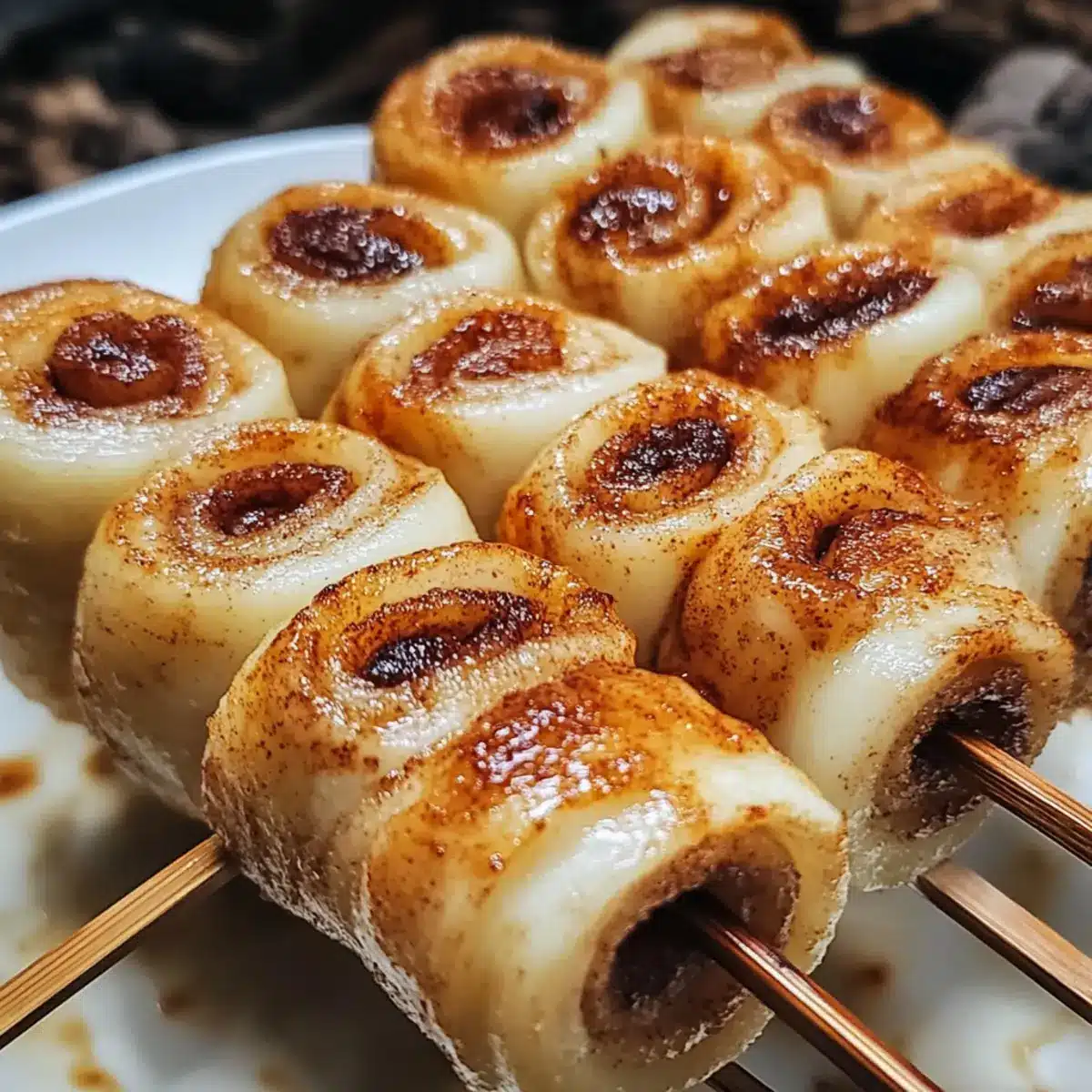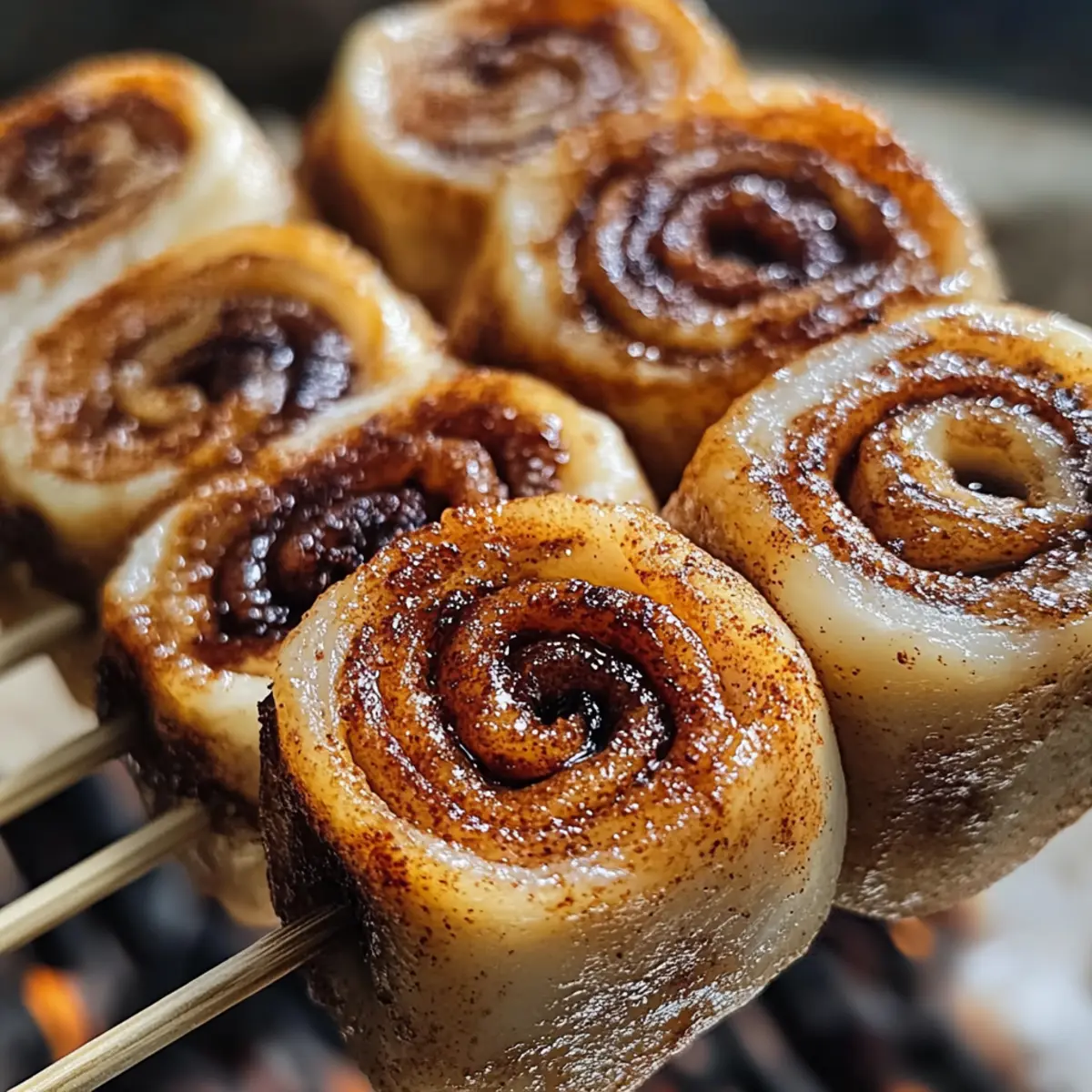 Um ein Anbrennen zu vermeiden, halte die Skewers über den glühenden Kohlen und nicht über offenen Flammen. Drehe die Skewers regelmäßig, damit die Zimtschnecken-Wickel gleichmäßig garen. Sollteste du bemerken, dass sie zu schnell bräunen, halte sie einfach weiter weg von der direkten Hitze.
